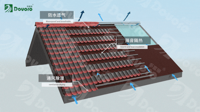 波形瀝青瓦與波形瀝青防水板,采用瀝青作為原材料之一,大大提升瓦材的防水效果。在造型設(shè)計上,使用波浪的排水造型,防排結(jié)合,提升屋面整體的防水性能。