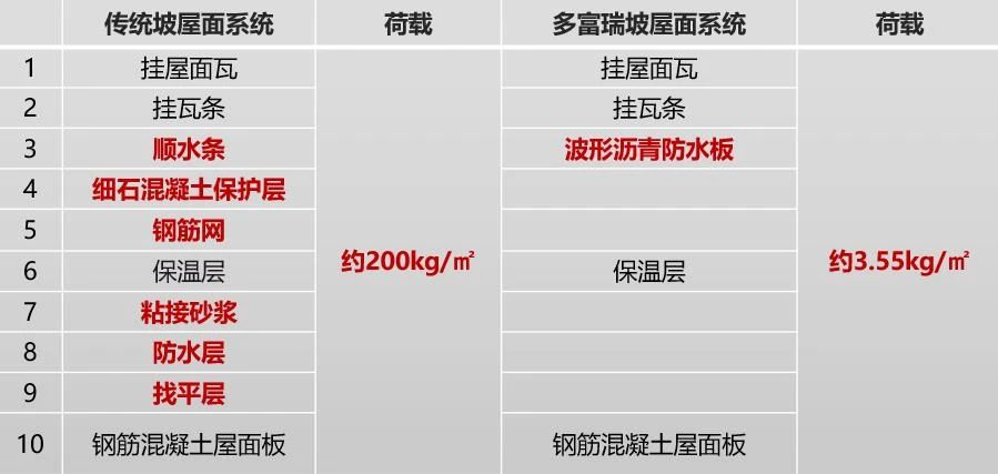 傳統(tǒng)坡屋面中的細(xì)石混凝土保護(hù)層、鋼筋網(wǎng)、砂漿、找平層都是重量大戶,每平米約200kg。波形瀝青防水板每平米僅重3.55kg,即可代替200kg的屋面構(gòu)造。