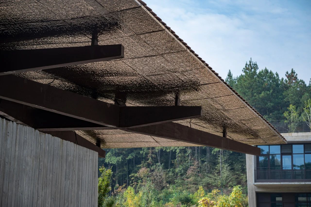 景德鎮(zhèn)是世界著名瓷都,作為藝術(shù)氛圍濃厚的特色高校,在景德鎮(zhèn)藝術(shù)職業(yè)大學(xué)的設(shè)計(jì)中,就將景德鎮(zhèn)獨(dú)特的地域氣質(zhì)融入和延展在空間之中。屋面設(shè)計(jì)還需要考慮到整體風(fēng)格的美感,和傳統(tǒng)文化的表達(dá),最終采用了具有不規(guī)則紋理的陶瓦,搭配波形瀝青防水板進(jìn)行施工。
