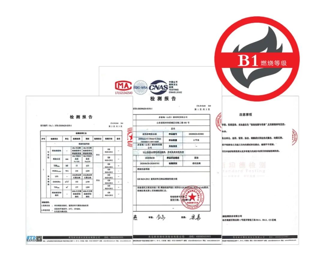 多富瑞2.0系列產(chǎn)品,包括波形瀝青瓦和波形瀝青防水板均符合最新的《建筑材料及制品燃燒性能分析》(GB8624-2012)B1級防火標準。
