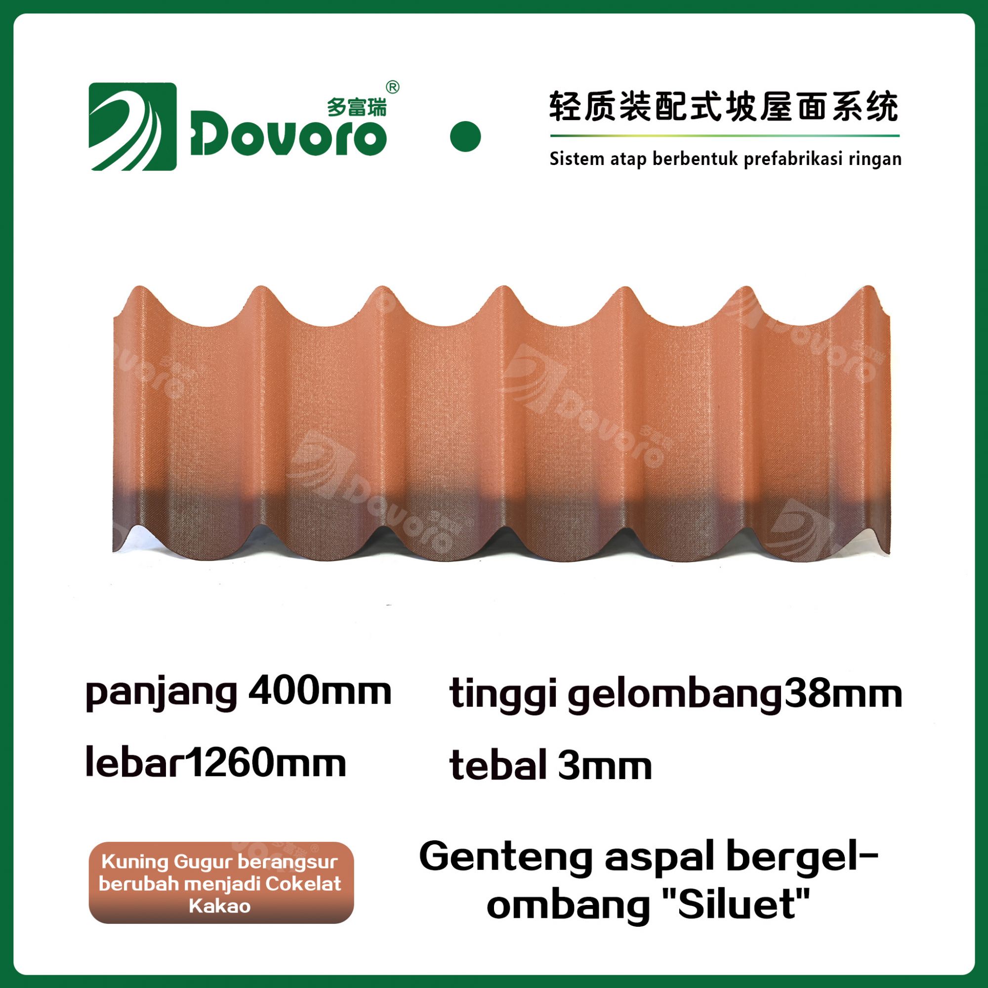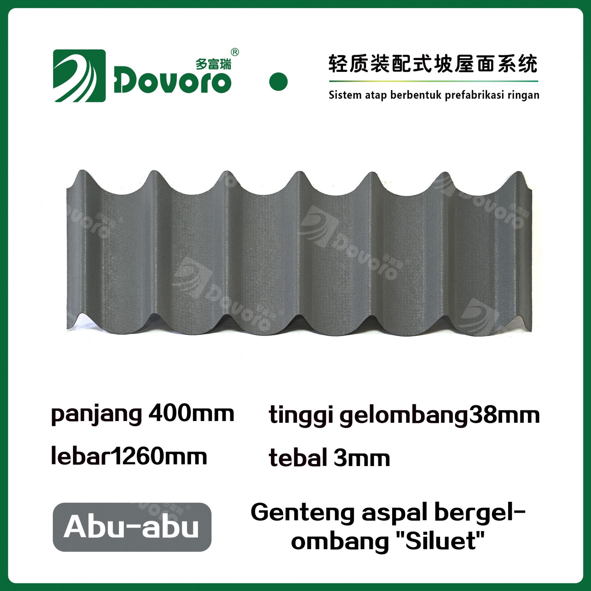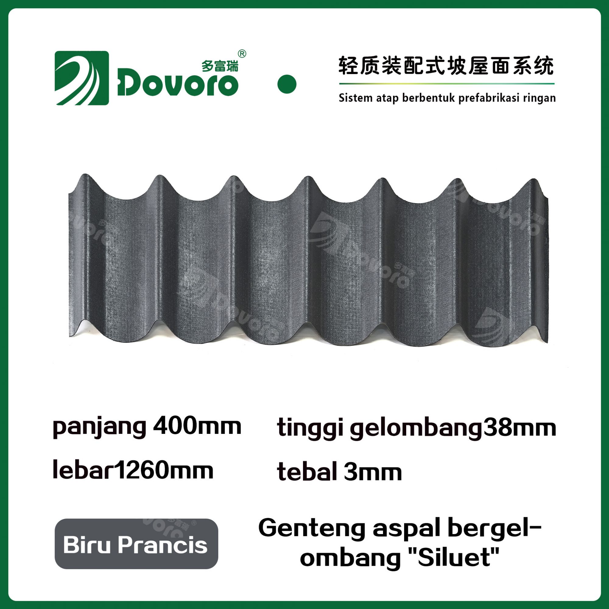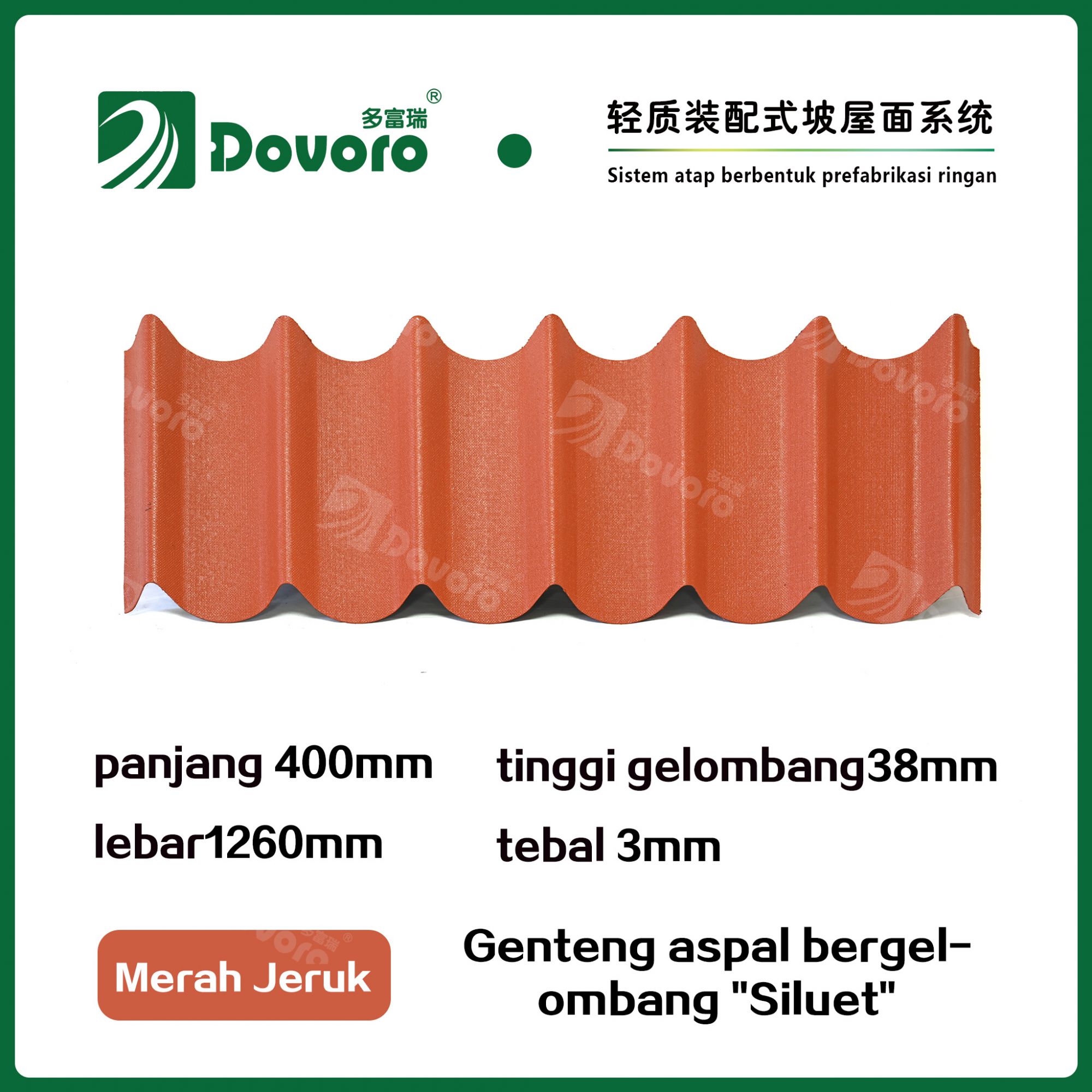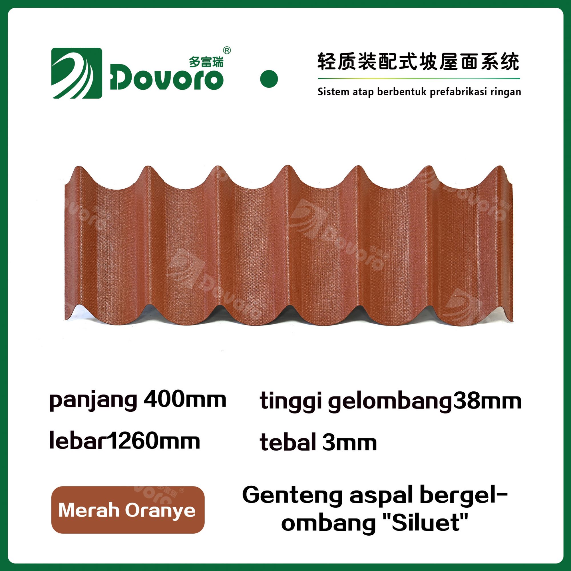 Genteng aspal bergelombang "Siluet" Dovoro terbuat dari serat mineral tumbuhan yang direndam dalam aspal. Plat dasar yang dibentuk sekali direndam dalam aspal pada suhu tinggi, menjadikan genteng ini lebih kokoh secara keseluruhan; Resin tahan panas menjamin kekuatan dan kekakuan genteng; dengan adanya teknologi pewarnaan canggih, material baku impor dipastikan memiliki warna yang tahan lama, dan proses penyemprotan warna campuran membuat genteng ini tampak elegan, berwarna cantik, dan memberikan tampilan tiga dimensi.
